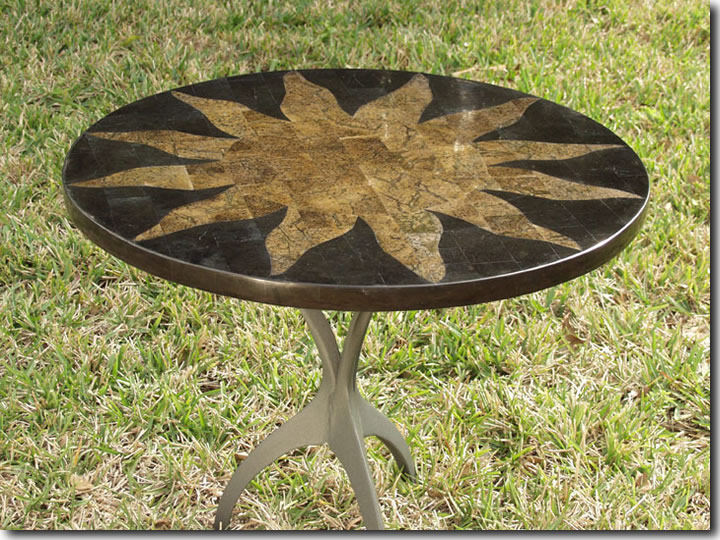 The Aztec Sun Table Top comes in 24" round, 30" round, 48" round, 25"x38" oval, 44"x74" oval, 44"x84" oval, and 38" x 108" oval sizes. Photos of all top sizes are available upon request. Click HERE to see the Aztec Sun Oval Top. Other sizes are available by special order, contact us. All sizes of Atelier stone tops are a generous 1-1/4" thick. All tops are fully finished in smooth highly polished stone - no rough stones, rough edges, or grout lines. Bottoms are fully finished in smooth stone to 1-1/2" from edge - no rough surface to touch. Atelier tops fasten to any type of table base with standard stainless wood screws. (table bases shown are generic and not for sale) |