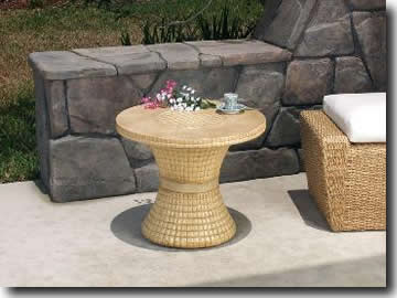 Accent / Side Table: 16" diameter base 24" x 1-1/4" round top 19" high overall. Top has edge of coco squares, surface has an 11 1/2" center of coco squares, balance of top is raffia. Center accent of base is raffia.