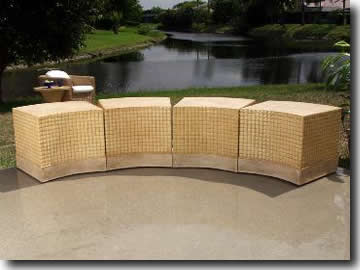 Curved Seat (also may be used as serpentine bench, ottoman, or occassional table): Top surface and bottom accent is raffia. 18" deep, 17" high 18" wide at front curve, 22" wide at rear curve. Custom Cushions Optional; COM available