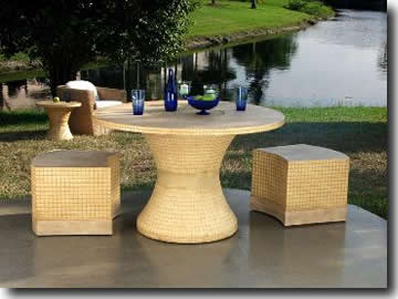Dining Table: Base 26" diameter at top & bottom 16" diameter at center 48" x 1-1/4" round top 30" high overall Top has edge of coco squares, surface has an 18" diameter center of coco squares, balance of top is rafia. Center accent of base is raffia.